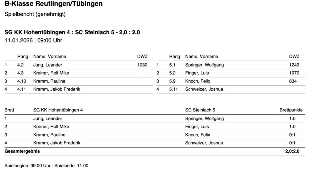 Am heutigen Spieltag erreichte unsere 4. Mannschaft ein solides 2:2-Unentschieden gegen Steinlach 5. Damit knüpfen wir erfolgreich an unsere bisher starke Saison an und bestätigen unsere gute Form. Die einzelnen Partien waren dabei stark umkämpft. Leander (1) spielte ein ruhiges und strategisch geprägtes Spiel, das schließlich in ein Endspiel mit Turm und Springer gegen Turm und Läufer mündete. Während der gegnerische Läufer und Turm an die Verteidigung der Bauern gebunden waren, gelang es Leander, mit dem Springer flexibel in die gegnerischen Reihen einzudringen. Dieser Druck führte schließlich dazu, dass der Gegner aufgab.