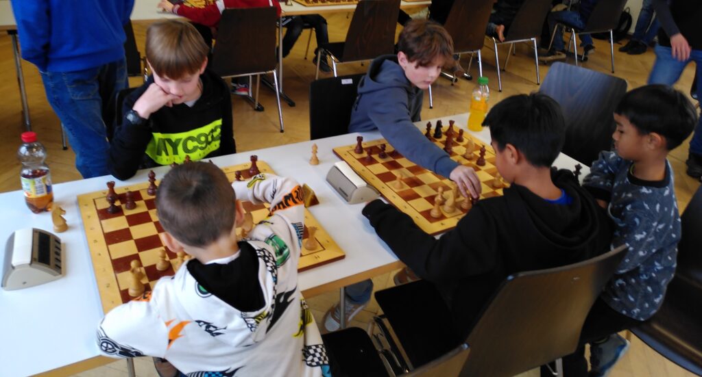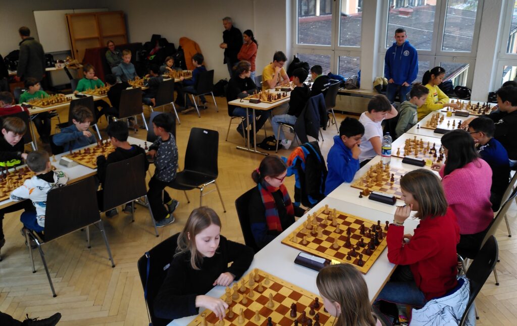 Nachdem unsere Stadtjugendmeisterschaft dieses Mal sogar im WhatsApp-Kanal der Württembergischen Schachjugend angekündigt wurde, trudelten auf einmal Anmeldungen von Nah und vor allem von Fern ein, sogar aus Ulm kam eine Gruppe. Am Ende waren 30 Spielerinnen und Spieler in der Hermann-Hepper-Halle. Im Grundschülerturnier kämpften 14 um den Titel, während für das Schülerturnier 13 und bei den Jugendlichen 3 angemeldet waren. Die letzten beiden Turniere wurden zusammengelegt und nach einer kurzen Regelkunde (einige spielten ihr erstes Turnier) ging es los.